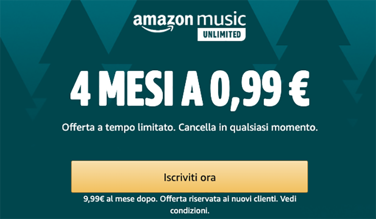 Se vi piace ascoltare musica invece di scaricarla o sentirla attraverso youtube non fatevi scappare l’occasione che Amazon ci propone, ben 4 mesi di Amazon Music a solo € 0,99 il catalogo dei brani comprende oltre 50 milioni di canzoni.