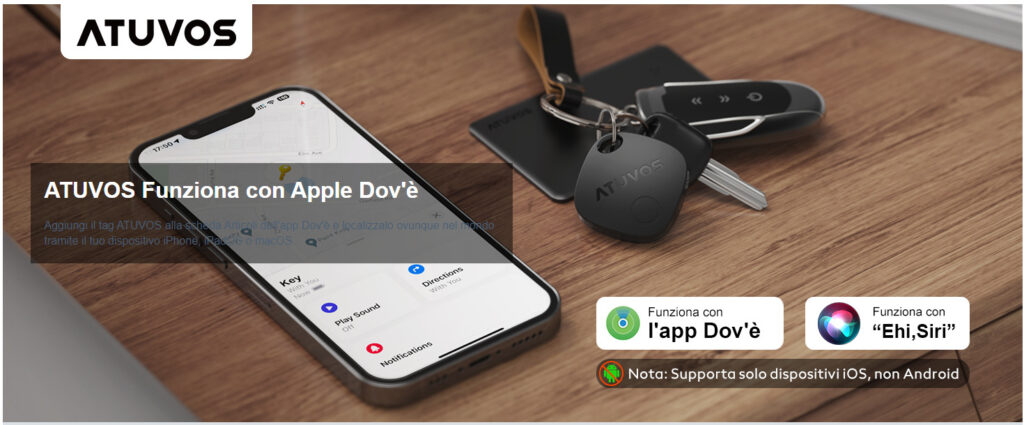 Un aspetto fondamentale da tenere in considerazione è che Apple ha creato la “Trova la mia rete”, che permette a produttori terzi di creare localizzatori compatibili con l’app “Trova il mio iPhone”. Quindi, l’ATUVOS Tag è praticamente identico all’AirTag in termini di specifiche e funzioni. Questo significa che, come l’AirTag, l’ATUVOS Tag funziona in perfetta armonia con l’ecosistema Apple, garantendoti un’esperienza di localizzazione senza soluzione di continuità.